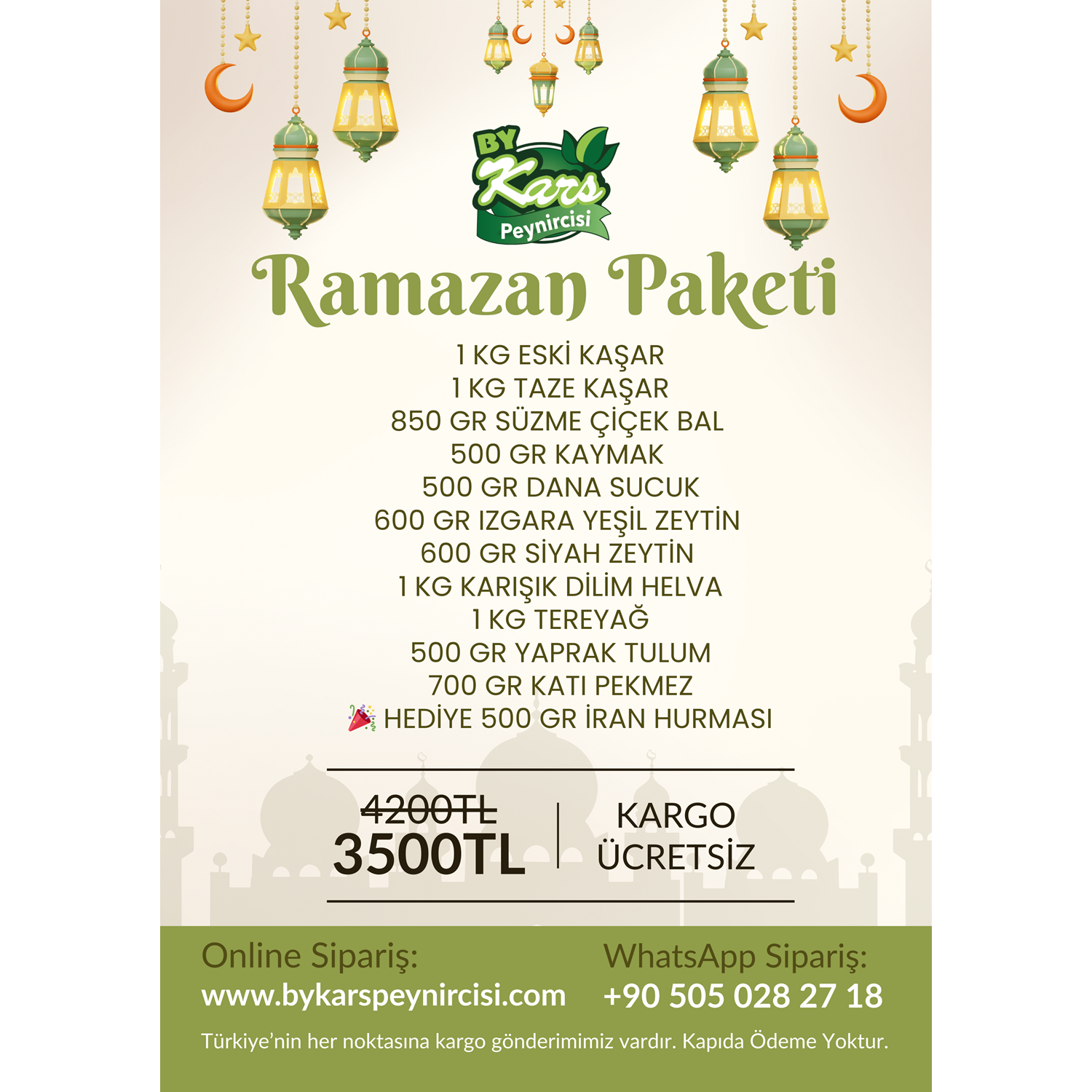 Kars Peynircisi'nden Ramazan Paketi 1 KG ESKİ KAŞAR 1 KG TAZE KAŞAR 850 GR SÜZME ÇİÇEK BAL 500 GR KAYMAK 500 GR DANA SUCUK 600 GR IZGARA YEŞİL ZEYTİN 600 GR SİYAH ZEYTİN 1 KG KARIŞIK DİLİM HELVA 1 KG TEREYAĞ 500 GR YAPRAK TULUM 700 GR KATI PEKMEZ